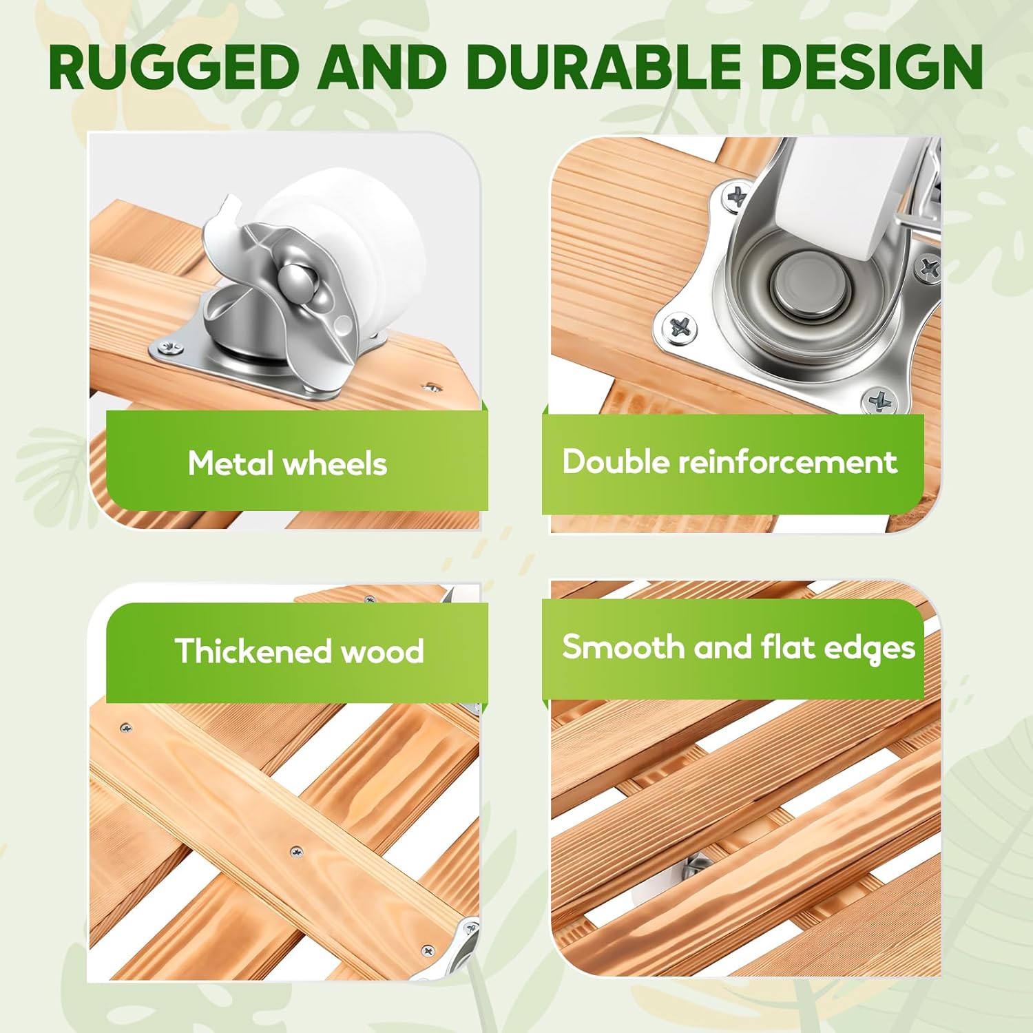 plant dolly with wheels -The fifth wheel has no brakes.The 5th center wheel design allows the load to be evenly distributed across the rolling mechanism, enabling easier mobility and higher load capacity than others with only 4 wheels -Effortless maneuverability,Equipped with four 360° swivel casters for ultra-smooth rolling on flat surfaces, so you can move heavy planters with minimal effo Product Specifications: Product: plant caddy with wheels Color: Wood color Material: Wood+Stainless steel size:35*35cm wheel:5 wheel Quantity: 4 pack Applicable: Suitable for large flower pots and indoor trees, ideal for patios, balconies, living rooms or gardens. Packliste: 4*plant rollers with wheels