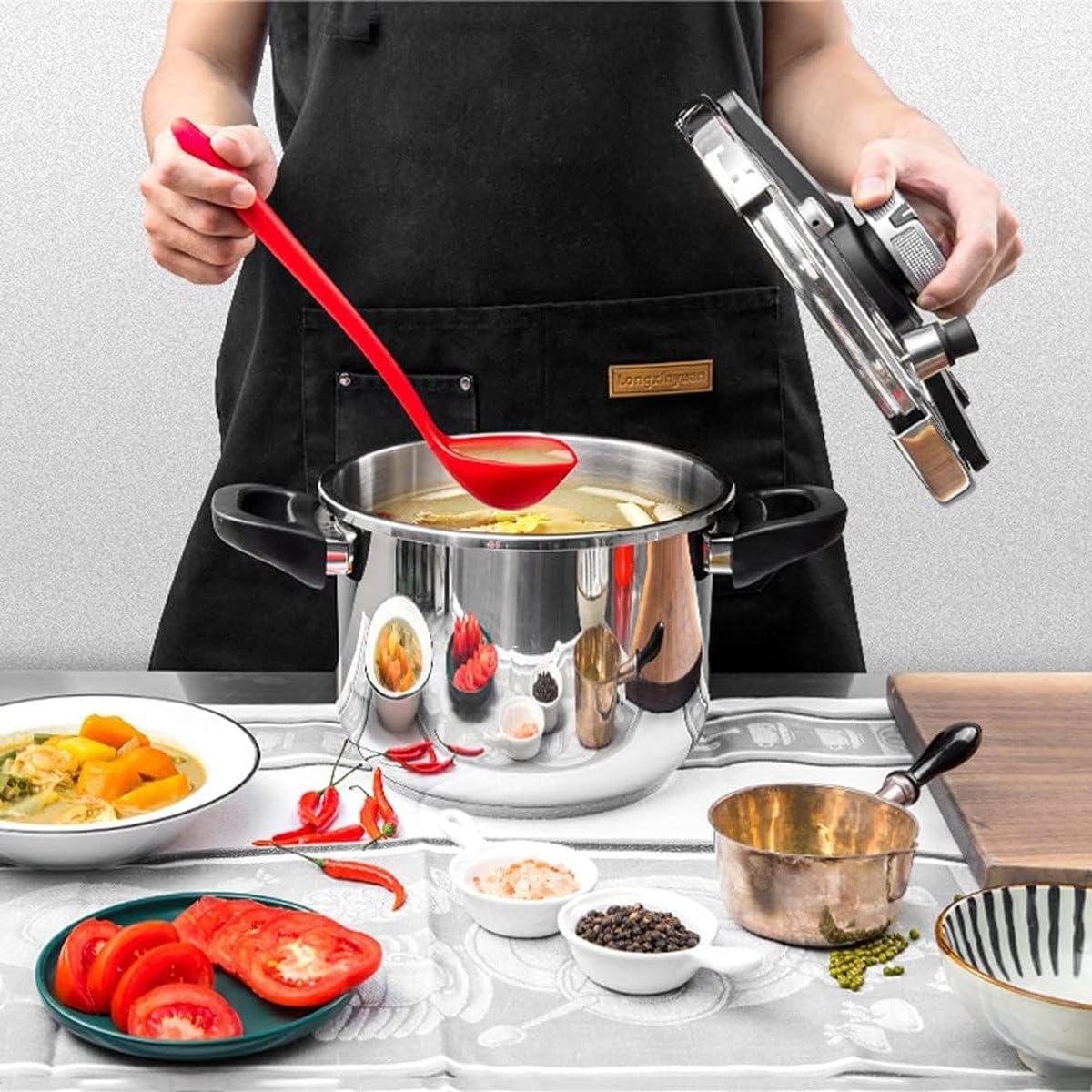 Transform your cooking experience with this versatile 6-liter pressure cooker designed for modern kitchens. Compatible with all heat sources including induction, this stainless steel powerhouse reduces cooking time and energy usage by up to 70%. Crafted from premium 304 stainless steel with a robust 1 cm thick body and a 1.2 cm triple-layer composite bottom, this cooker ensures even heat distribution and lasting durability. The innovative twist-on lid mechanism enables convenient one-handed operation, making it perfect for busy home cooks. The ergonomic handle provides a secure grip while maintaining comfort during use. Whether you're preparing tender meats, hearty stews, or wholesome legumes, this pressure cooker helps lock in nutrients and flavors through its efficient cooking process. The generous 6-liter capacity is ideal for family meals or batch cooking, while the sturdy construction promises years of reliable use in your kitchen.